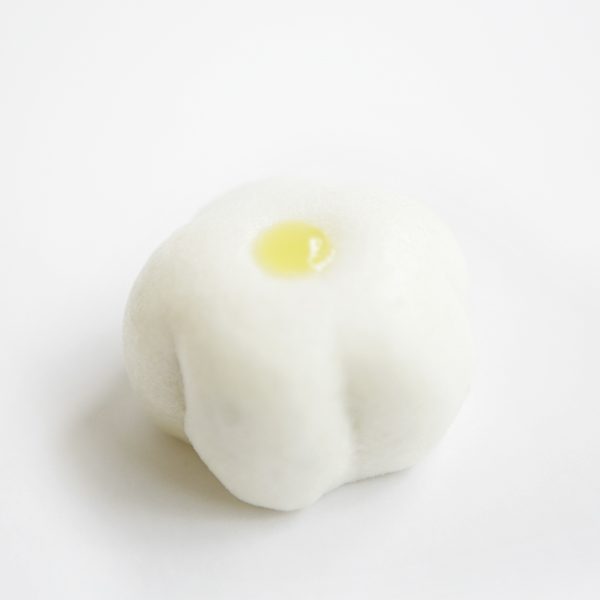 ハローライフのロゴにある花から発想してつくったこのお菓子は、まだカタチがしっかりと形成されていないやわらかなフォルムで花とも星ともとれる曖昧さを、可能性に示唆して表しました。また白い色には、これから何色にも染まれる無限の可能性と、仕事や人生を勝ち取る「白星」の意味合いも込めています。さらに、中の餡には驚きの仕掛が。。。