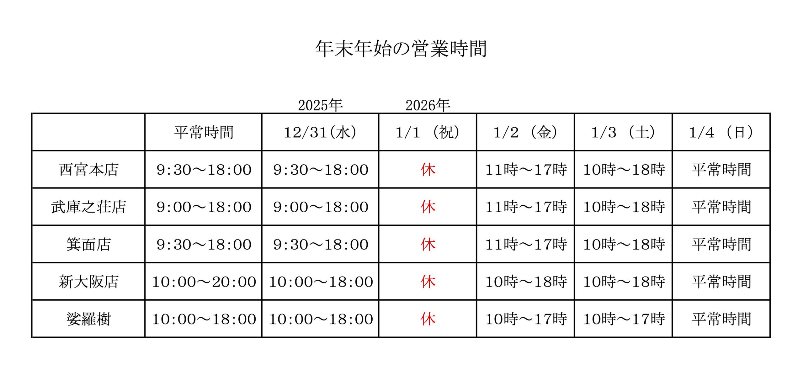 年末年始の各店の営業日および営業時間をご案内させていただきます。